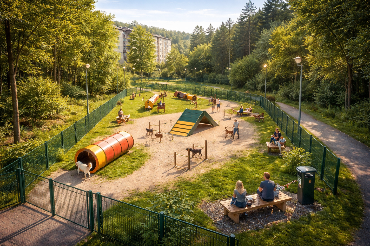 Ławki i stojaki dla właścicieli, pojemniki na śmieci i odchody – wszystko, aby teren był czysty, wygodny i przyjazny mieszkańcom.