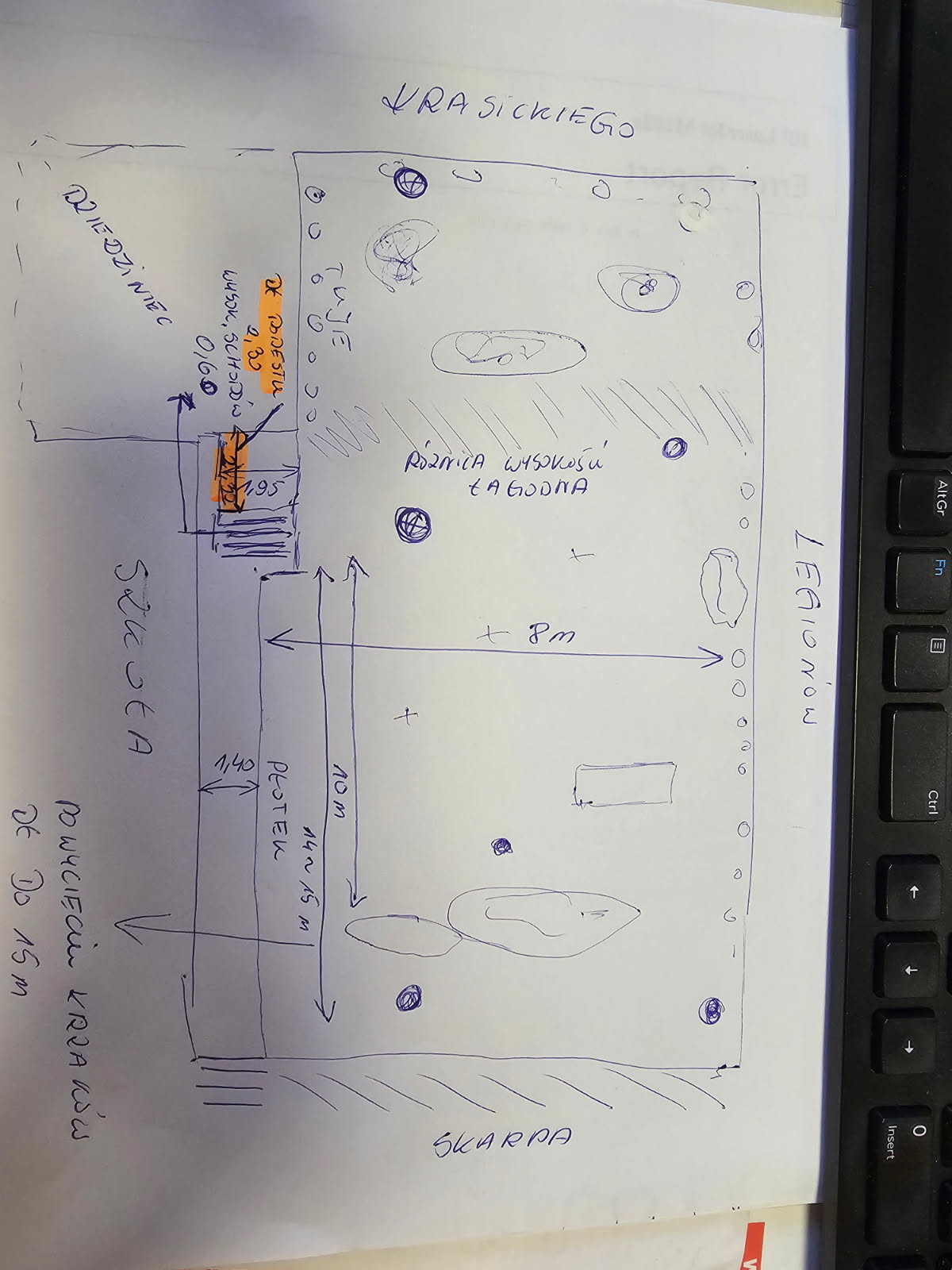 Umiejscowienie: teren zielony przy szkole miedzy płotem, a chodnikiem wzdłuż ul. Legionów. Wskazany na zdjęciach. Wejście na teren od ul. Krasickiego przez furkę i dziedziniec szkolny. Wejście dla uczniów oraz osób z niepełnosprawnością możliwe będzie poprzez renowację betonowych schodów zastępując je rampą bądź zjazdem. Konieczne jest częściowe usunięcie siatki, 4 metalowych słupków oraz jednej z bramek, co spowoduje lepsze dostosowanie i otwarcie przestrzeni.