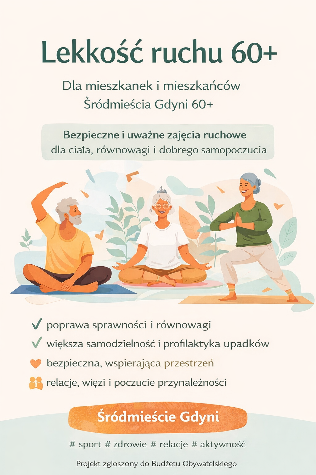 Projekt zakłada organizację bezpłatnych zajęć ruchowych dla mieszkańców Gdyni w wieku 60+. Spotkania będą odbywać się raz w tygodniu i będą obejmować łagodny trening wzmacniający, ćwiczenia równowagi, mobilności oraz elementy oddechowe i relaksacyjne. Zajęcia pomagają utrzymać sprawność fizyczną, poprawiają samopoczucie oraz tworzą przestrzeń do integracji i budowania relacji między mieszkańcami.